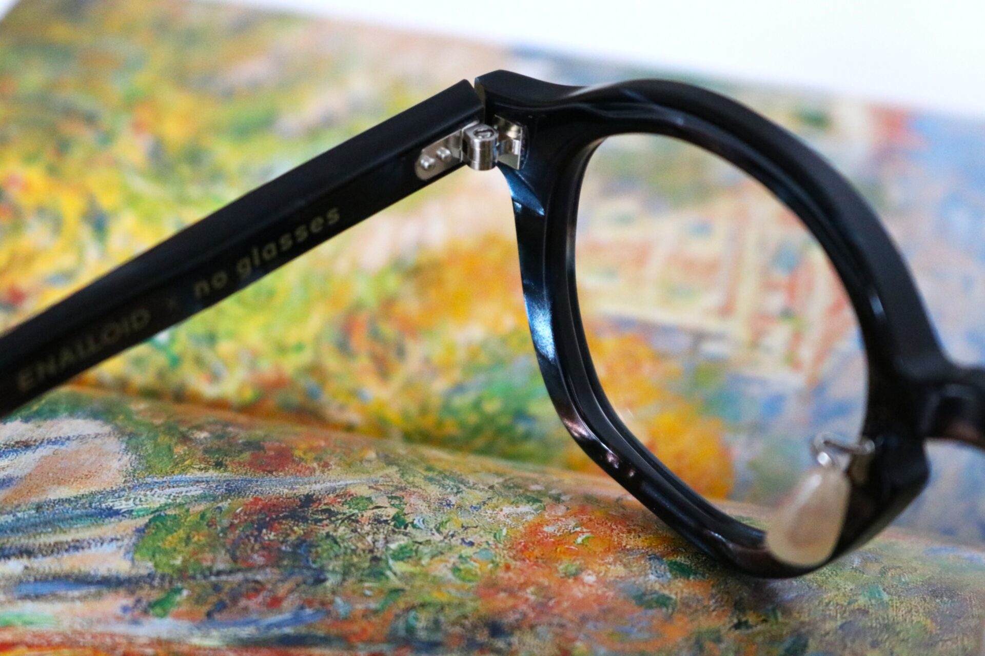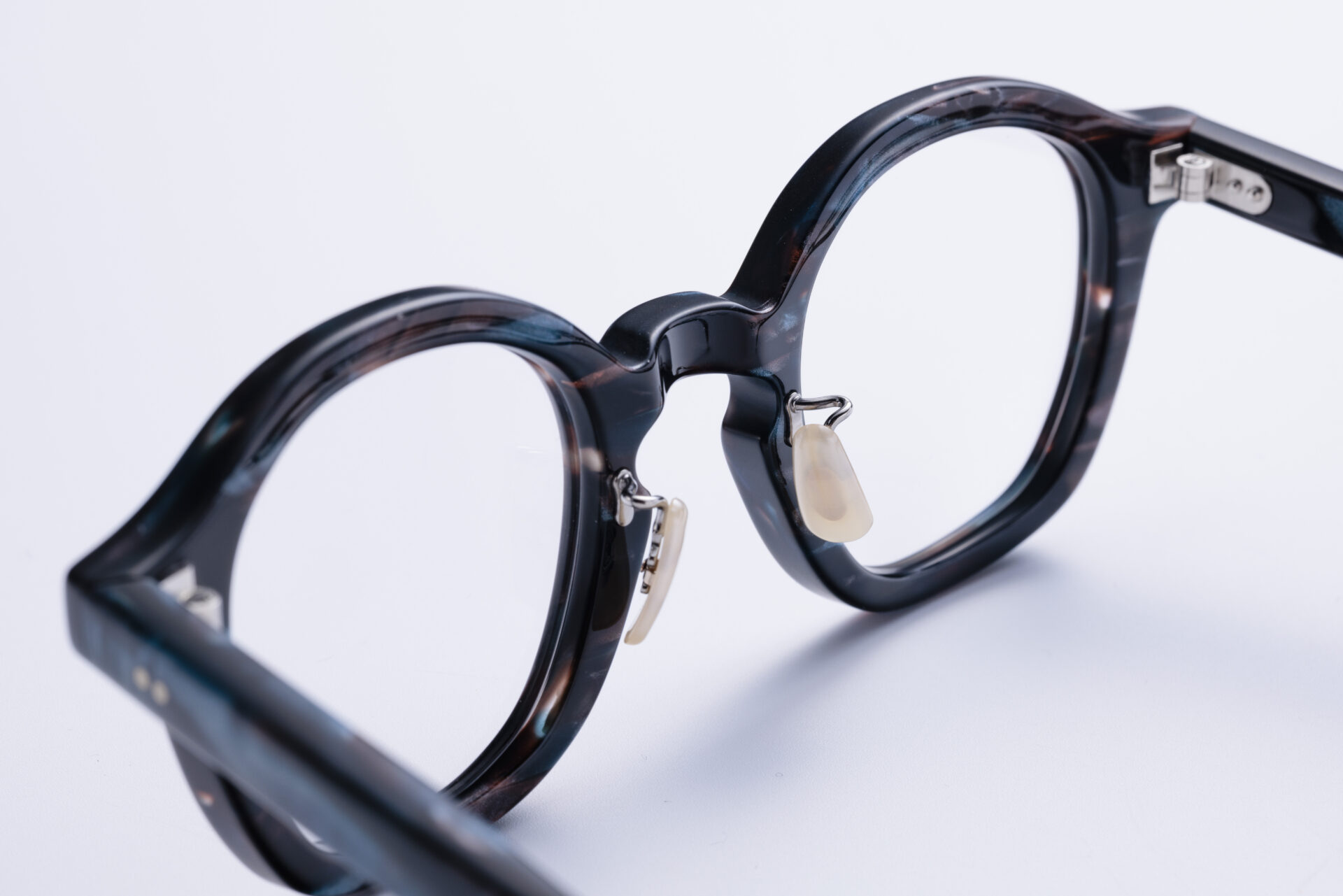 フロントリムは上下で厚みを変化させることでバランスを整え、タフな着用を実現するダブルピンのクリングスパーツに加え、ENALLOIDの生みの親である恵那眼鏡が誇る磨きの美しさが映える合口6mm厚のチューブ・テンプルを組み合わせています。
