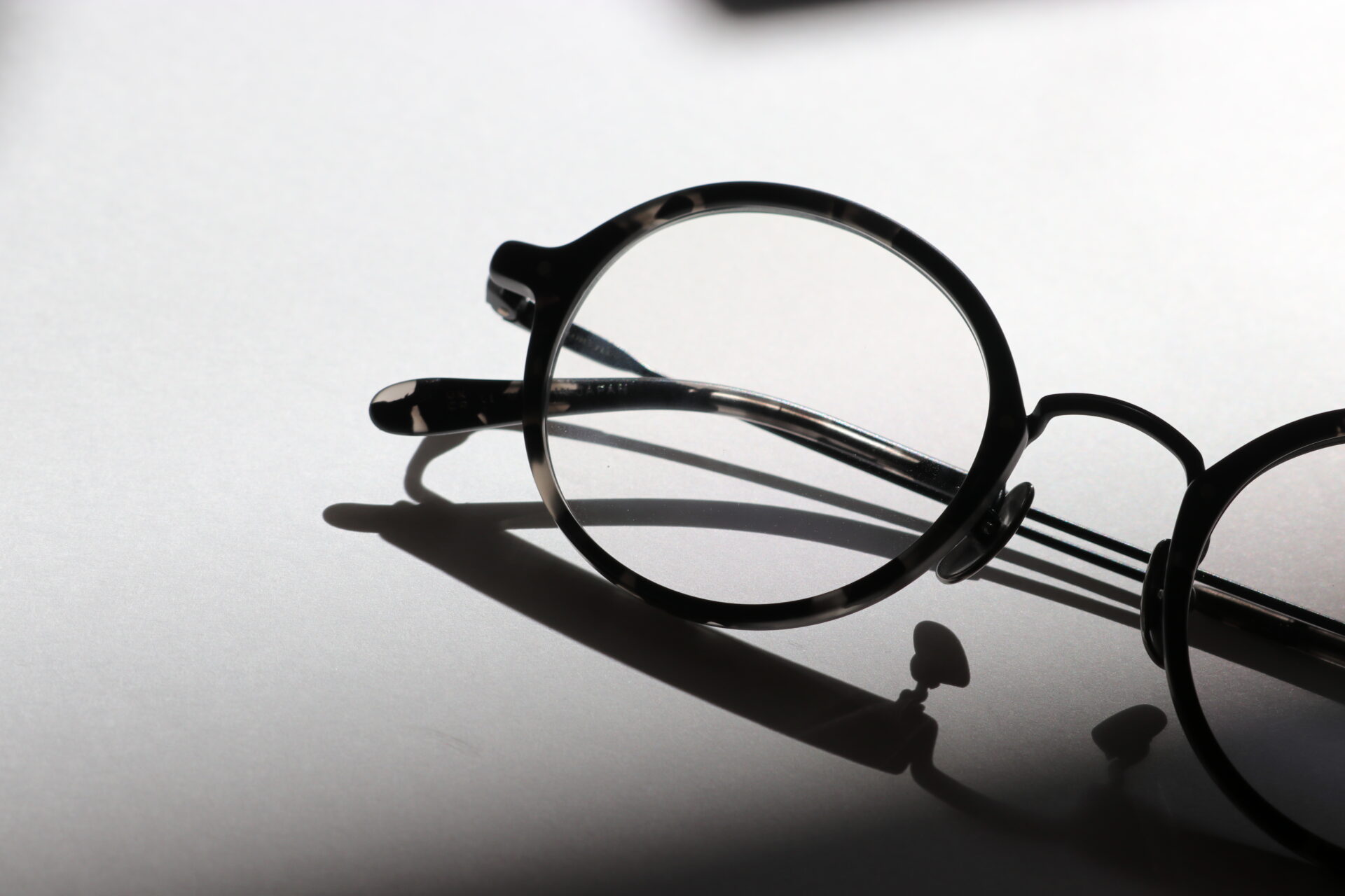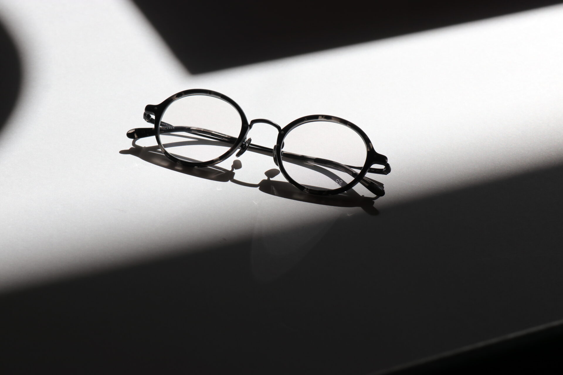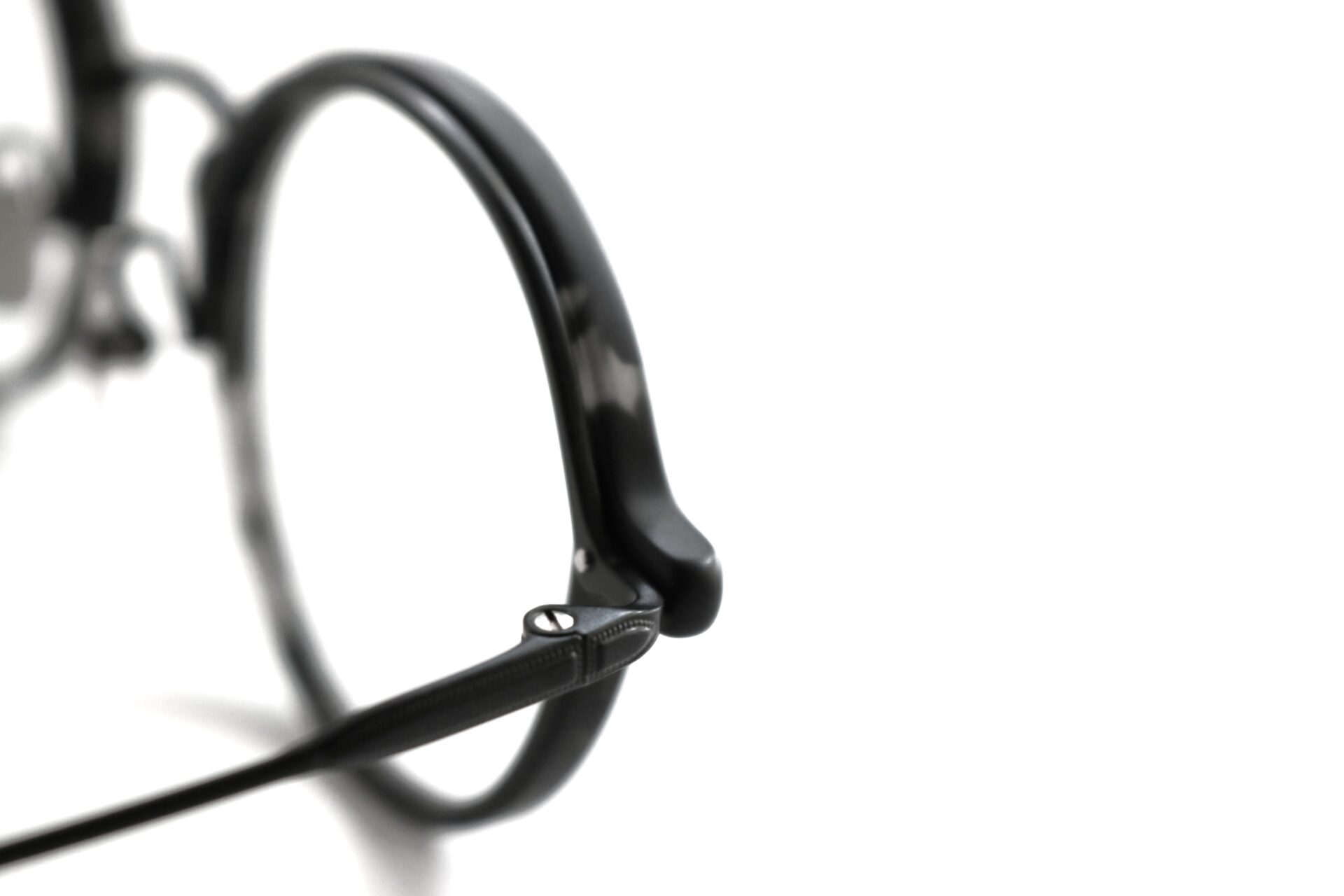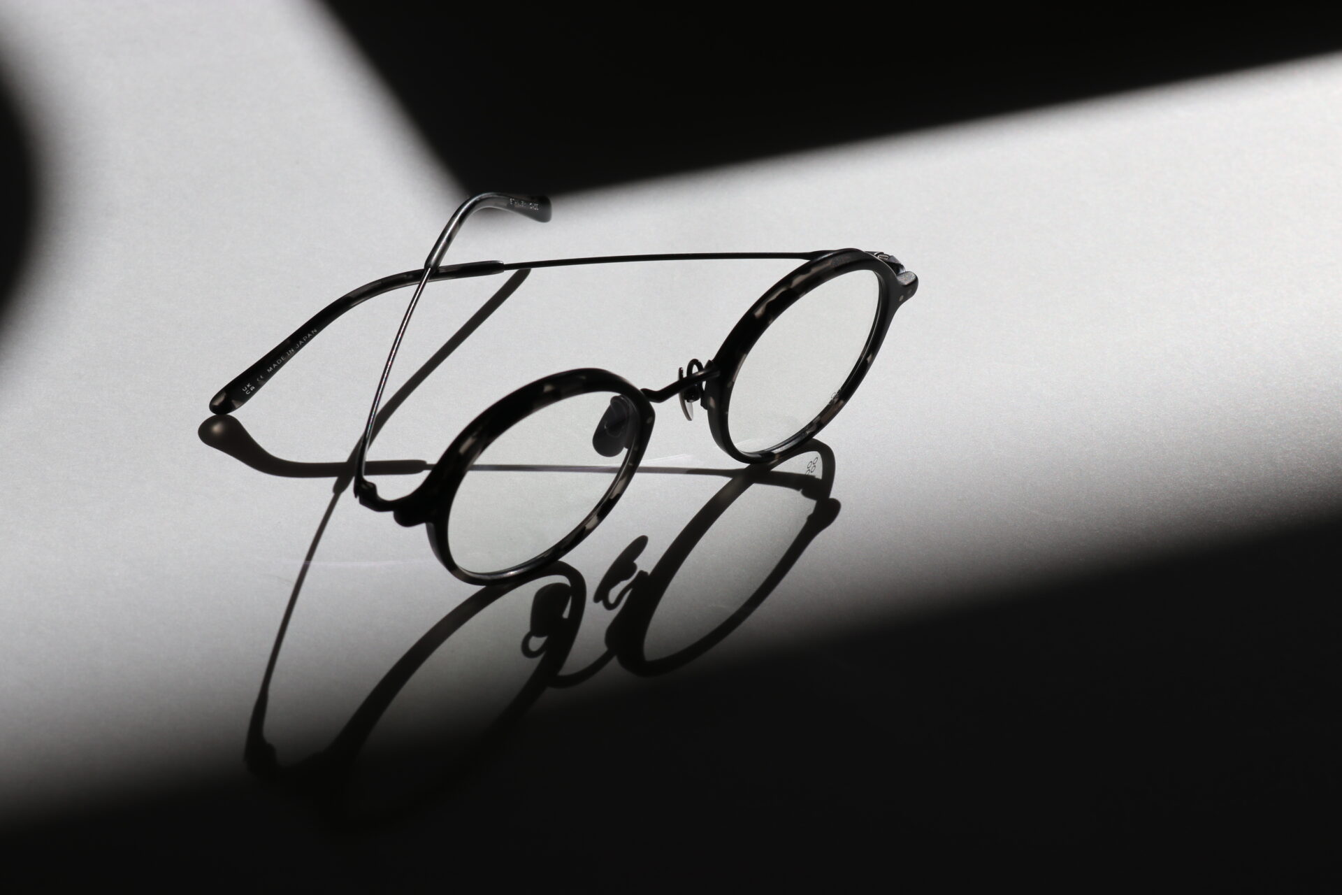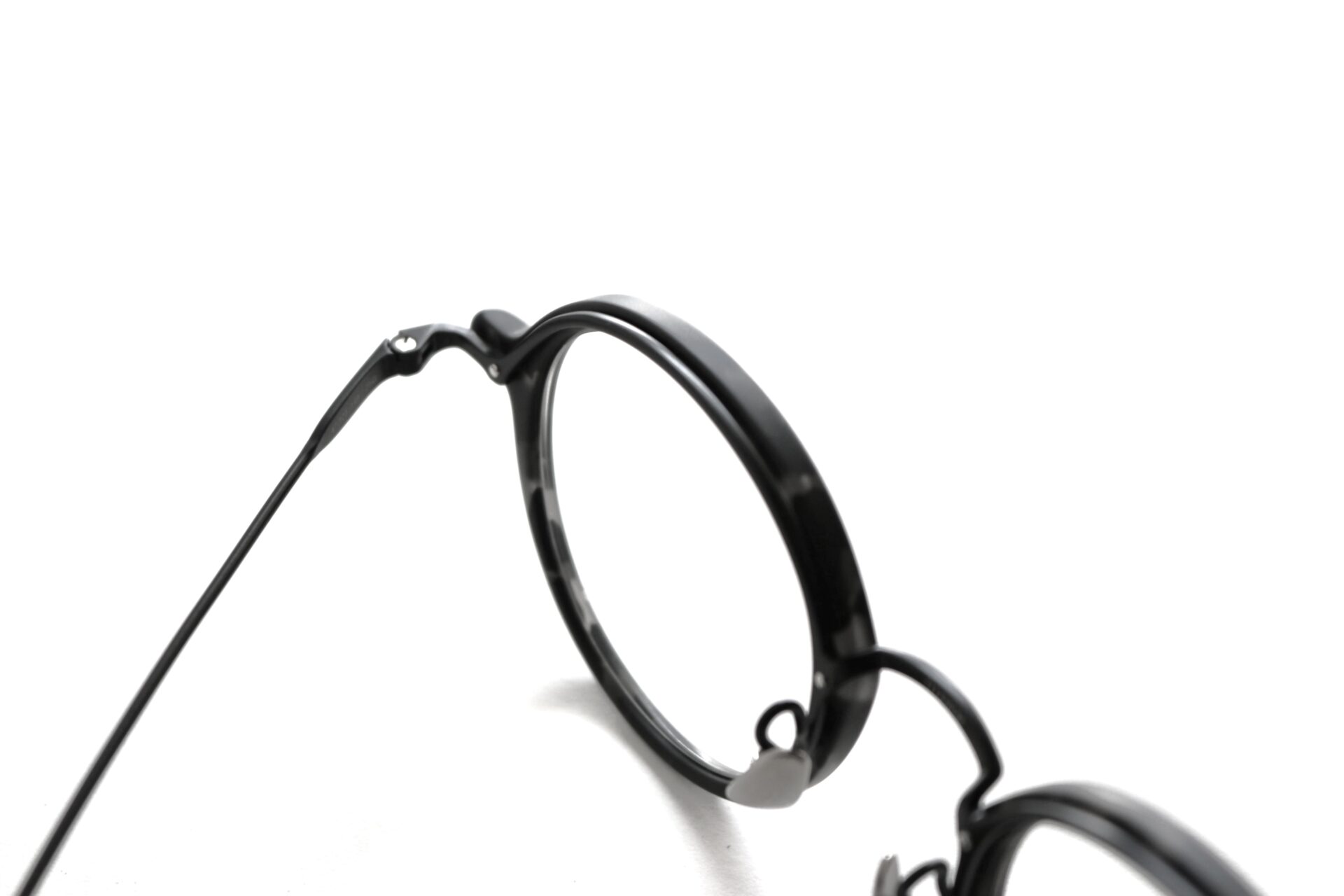 リムのアセテートには日本製で定評のあるタキロン・ローランド社製生地を採用。暗闇の中に光がランダムに注いでいるかのようなアセテート生地には、より黒を引き立てるためマット加工を施しています。メタル部分にはカラーコーティング最高峰のIP(イオンプレーティング)技術を用いたブラックマットで統一感を演出。耳にかかるモダンパーツにもマット加工を施した同色生地を採用し、ディテールにも拘ったno glassesだけの特別な仕様になっています。