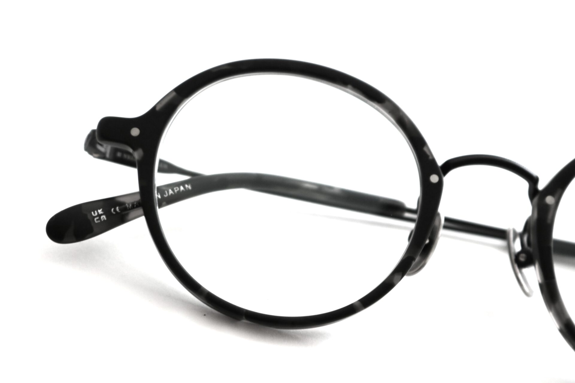 NICKY、ROLANDともに、YELLOWS PLUSの代名詞の一つとなっている、フレームにリムをカシメで固定する手法を継承した同モデル。フレーム素材はチタニウムを、レンズを留めるリム素材にはアセテートを使用しています。ノーズパッドにはチタンパッドを標準装備。軽量で耐久性に優れ、メガネで必要とされる調整範囲の広さに定評があるつくりとなっています。
